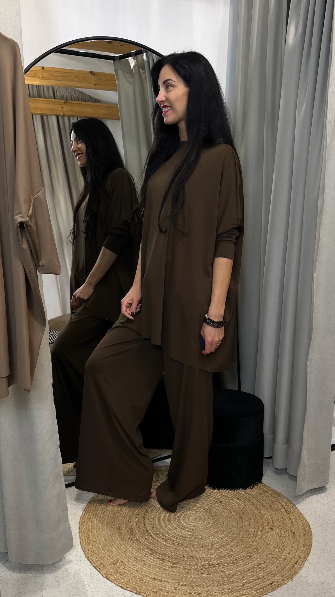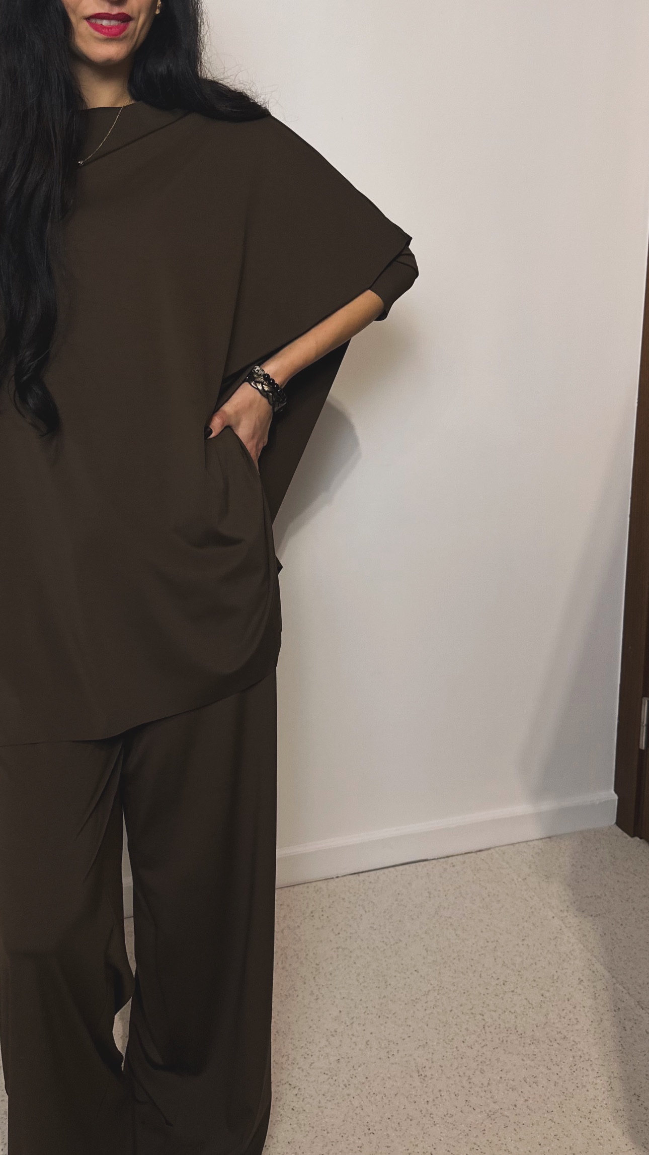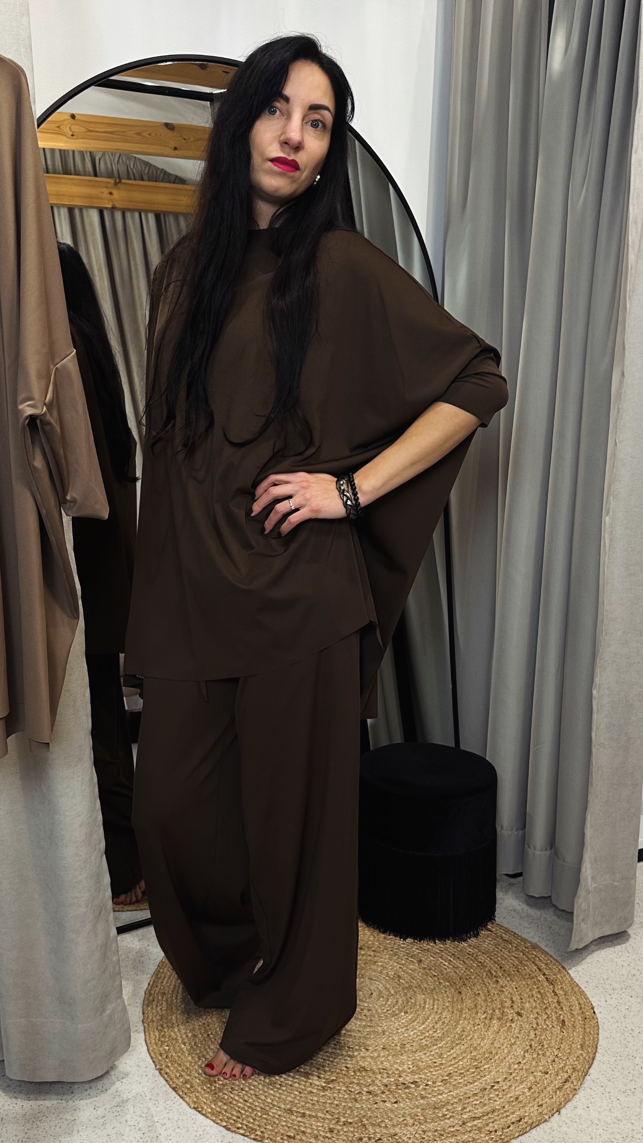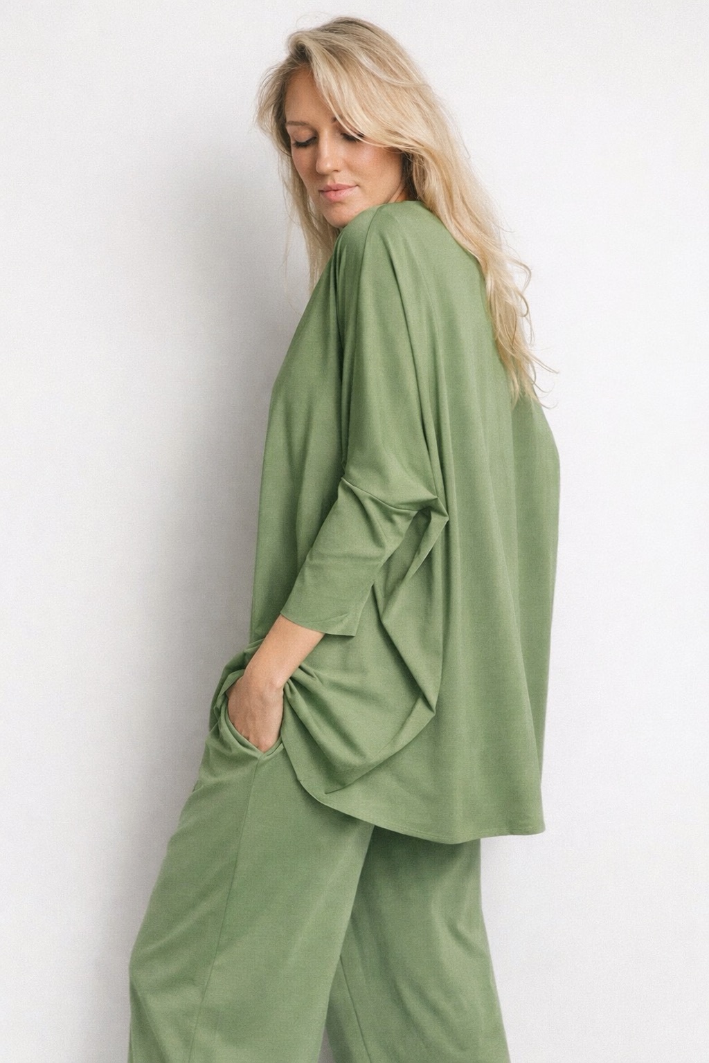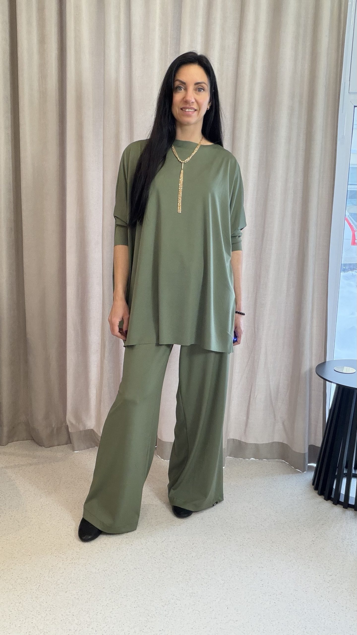 Elegants mājas tērps tavai ikdienai. Komplektā ir džemperis ar 3/4 piedurknēm un bikses ar elastīgu gumiju un sānu kabatām. Pieejams vairākās krāsās. Pilns komplekts ar čībām pieejams, pievienojot tās Pasūtījuma piezīmēs. Cena par čībām pilnā komplektā – 35.00 EUR.